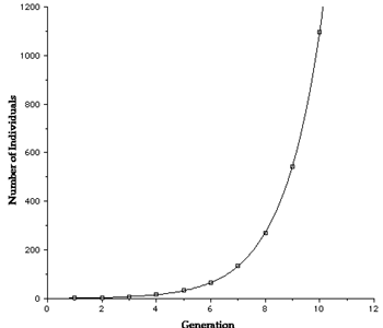 On est probablement ici en présence d'un phénomène obéissant à une loi exponentielle : la concavité de l'hostie n'évolue pas ou peu, jusqu'à ce que la température dépasse une certaine valeur, la concavité de l'hostie augmente alors brutalement. On peut représenter cela par un graphique, comme celui-ci, où l'on remplacerait le nombre d'individus en ordonnée par la concavité de l'hostie, et le nombre de génération en abscisse par la quantité d'énergie reçue (liée à la température).
